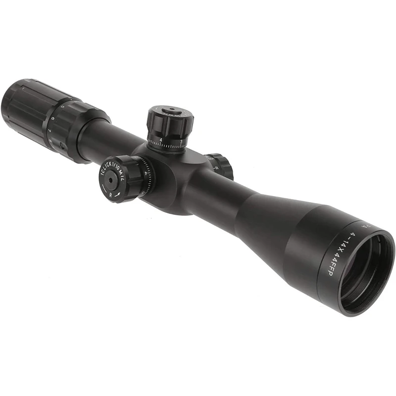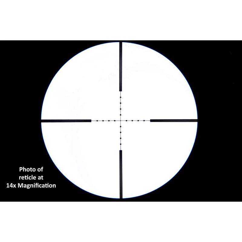 At the heart of the 4-14x44mm rifle scope is OptiCo’s first focal plane MIL-DOT reticle. Properly matched with MIL/MIL turret adjustments, this traditional reticle allows users to range and find their holdovers without being forced to use caliber specific BDC systems. Each dot is .25 MILs with a full MIL measured from the center of one dot to the next. For shooters who want a proven reticle with wide spread military acceptance, the MIL-DOT is perfect for you.